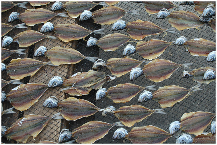 Sardinen werden am Strand von Nazare in Portugal getrocknet