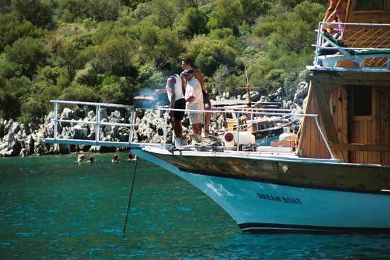 Die Tagestouristen aus Marmaris werden in den Badebuchten verwöhnt, sogar mit Grill auf dem Oberdeck