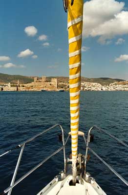| Wir nähern uns Bodrum und wissen noch nicht, dass der Hafen voll ist und wir im Vorhafen zwischen Gulets und Fähren eine unruhige Nacht verbingen werden.
