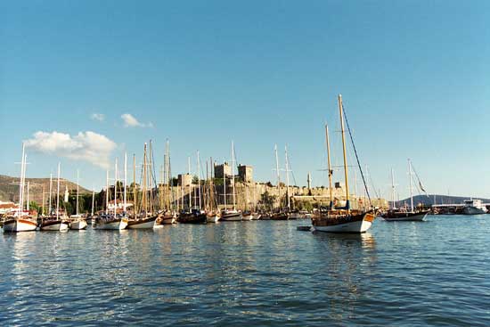 Im Vorhafen unter der Burgruine bei den Gulets und Fähren