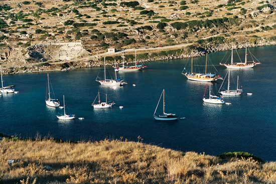 Die meisten Schiffe liegen nicht am Steg, sondern in der Bucht direkt am Theater