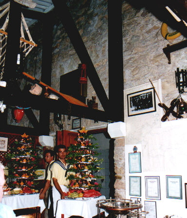 Feines Fischlokal und dann werden wie beim Traumschiff im Dunkeln die Kerzen am Baum angezündet und durch das Lokal gefahren